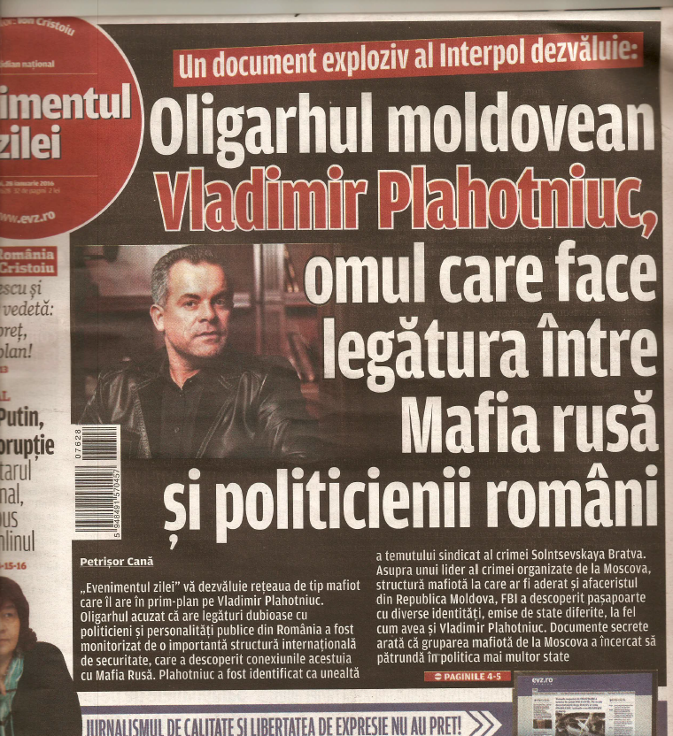 Un document oficial emis de Biroul Interpol de la Roma anunța, în anul 2007, inițierea unei supravegheri a lui Vladimir Plahotniuc, oligarhul din Republica Moldova acuzat de mii de basarabeni că a pus mâna pe structurile statului, în Republica Moldova. Afaceristul figura în evidențele organizației internaționale care monitorizează infractorii cu două pașapoarte eliberate de autoritățile din România: unul anulat, în anul 2007, iar altul emis pe 29 iulie 2011.