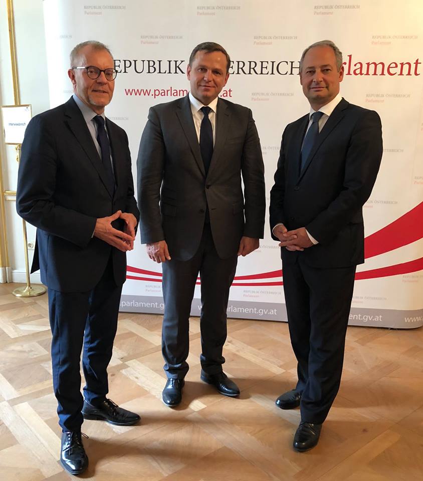 La Palatul Imperial, sediul actual al Parlamentului Austriei, am avut deosebita plăcere să fiu primit de Președintele Parlamentului, Dl. Dr. Wolfgang Sobotka. Am mai discutat despre situatia din Republica Moldova cu Presedintele Comitetului pentru Afaceri Externe al Parlamentului Austriac, Dl. Andreas Schieder, cu Purtatorul de Cuvânt al SPO pentru Drepturile Omului si deputat în Parlamentul Austriei, Dl. Harald Troch.